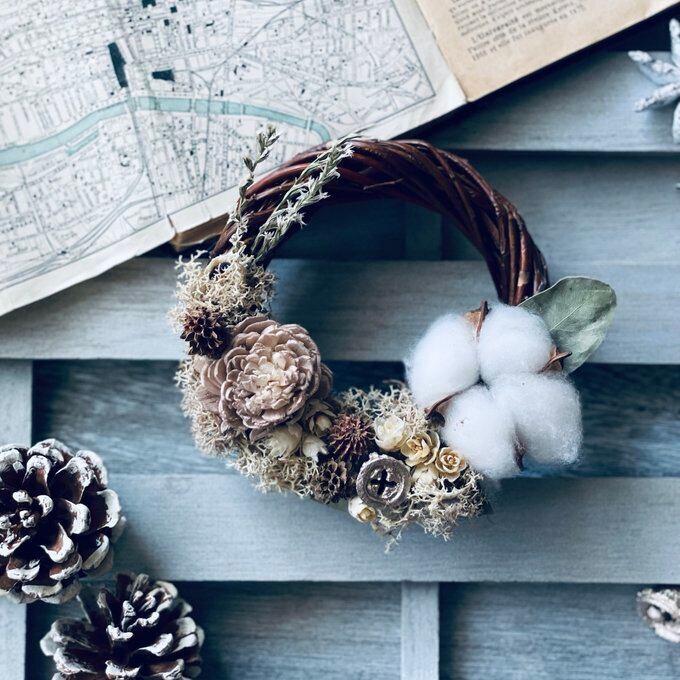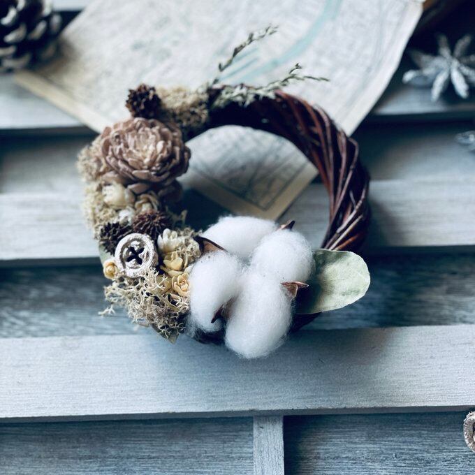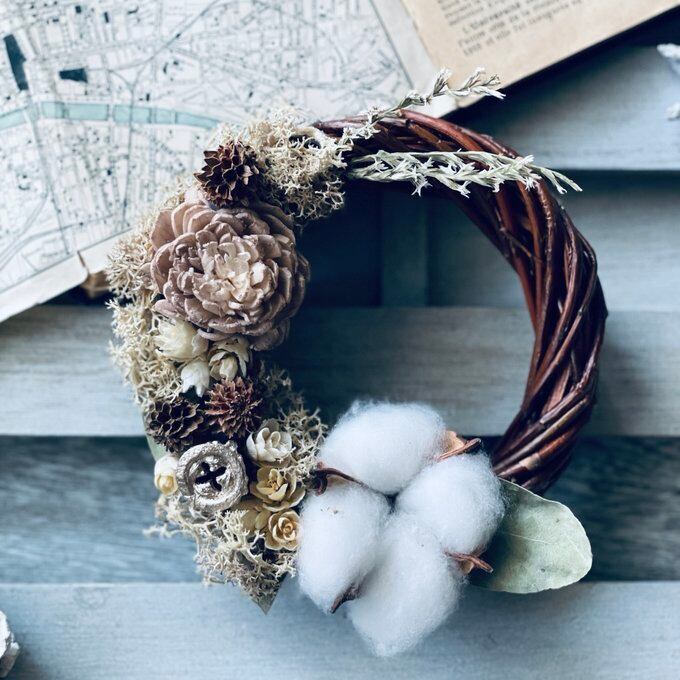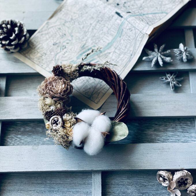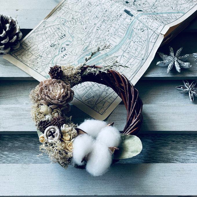 コットンやベージュローズ、ユーカリの実、